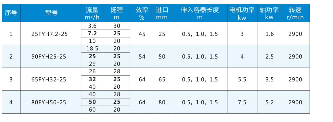 產(chǎn)品介紹: FYH型氟塑料液下泵為長(zhǎng)軸立式離心泵,液下深度0.5m - 1.5m,接觸液體部件使用氟塑料制造,具有耐腐蝕范圍廣、效率高、重量輕、無需灌液即可抽送介質(zhì)。適用于輸送不含顆粒雜質(zhì)的酸堿、溶劑、強(qiáng)氧化劑等,廣泛應(yīng)用于化工、制酸、制堿、冶煉、稀土、農(nóng)藥等行業(yè)。