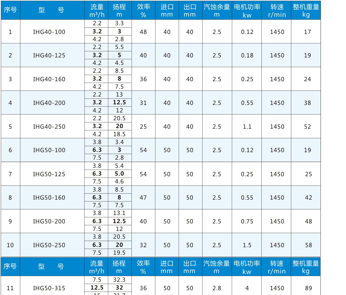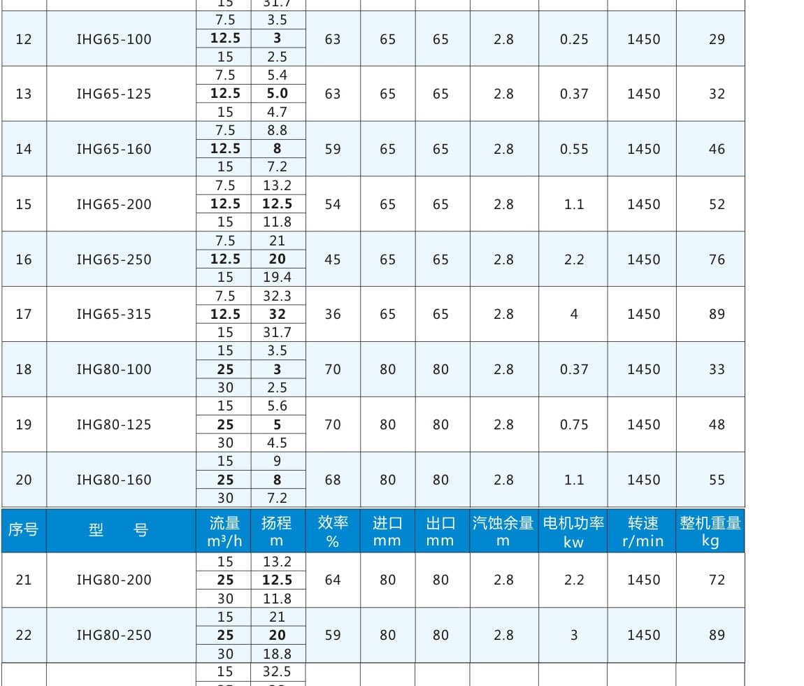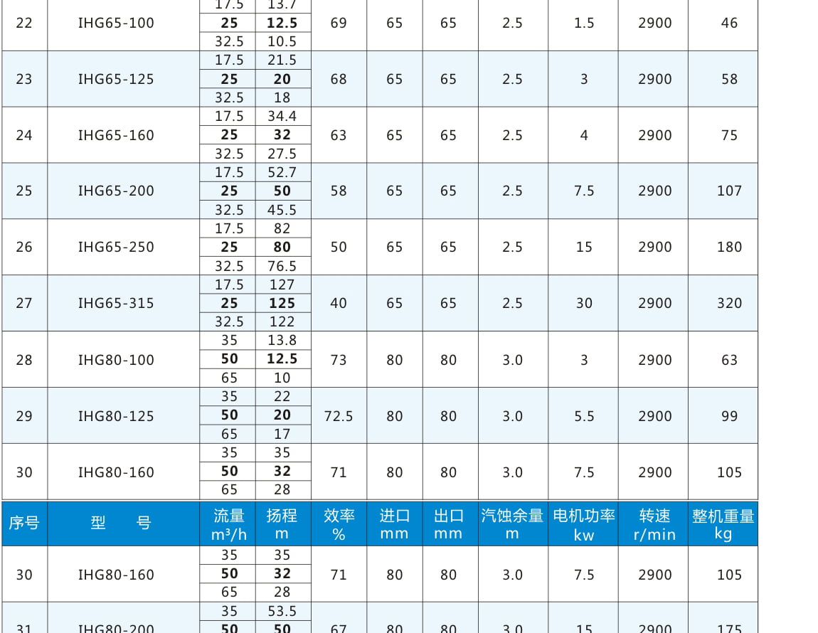 IHG:臥式不銹鋼管道泵代號丨 80:進(jìn)出口直徑80mm 丨 160:葉輪名義直徑160mm