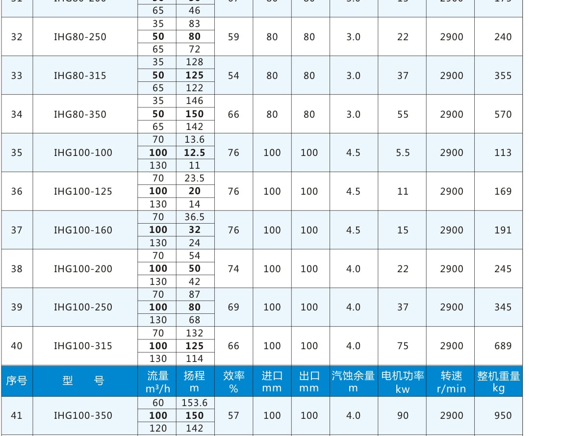 性能參數(shù)表:電機(jī)轉(zhuǎn)速2900r/min,表中流量揚(yáng)程加粗為額定參數(shù)