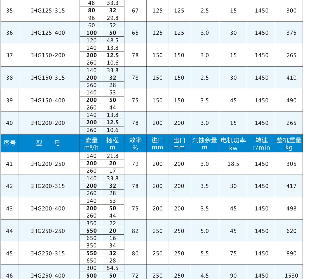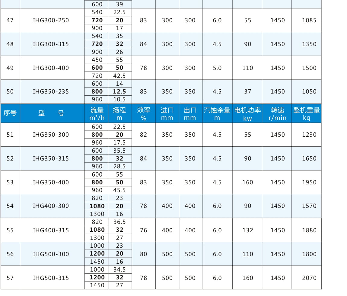 性能參數(shù)表二:電機(jī)轉(zhuǎn)速1450r/min,表中流量揚(yáng)程加粗為額定參數(shù)