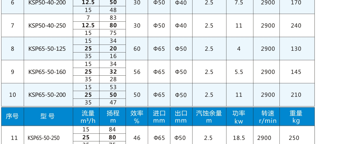 性能參數(shù)表(1):電機(jī)轉(zhuǎn)速2900r/min,表中流量揚程加粗為額定參數(shù)